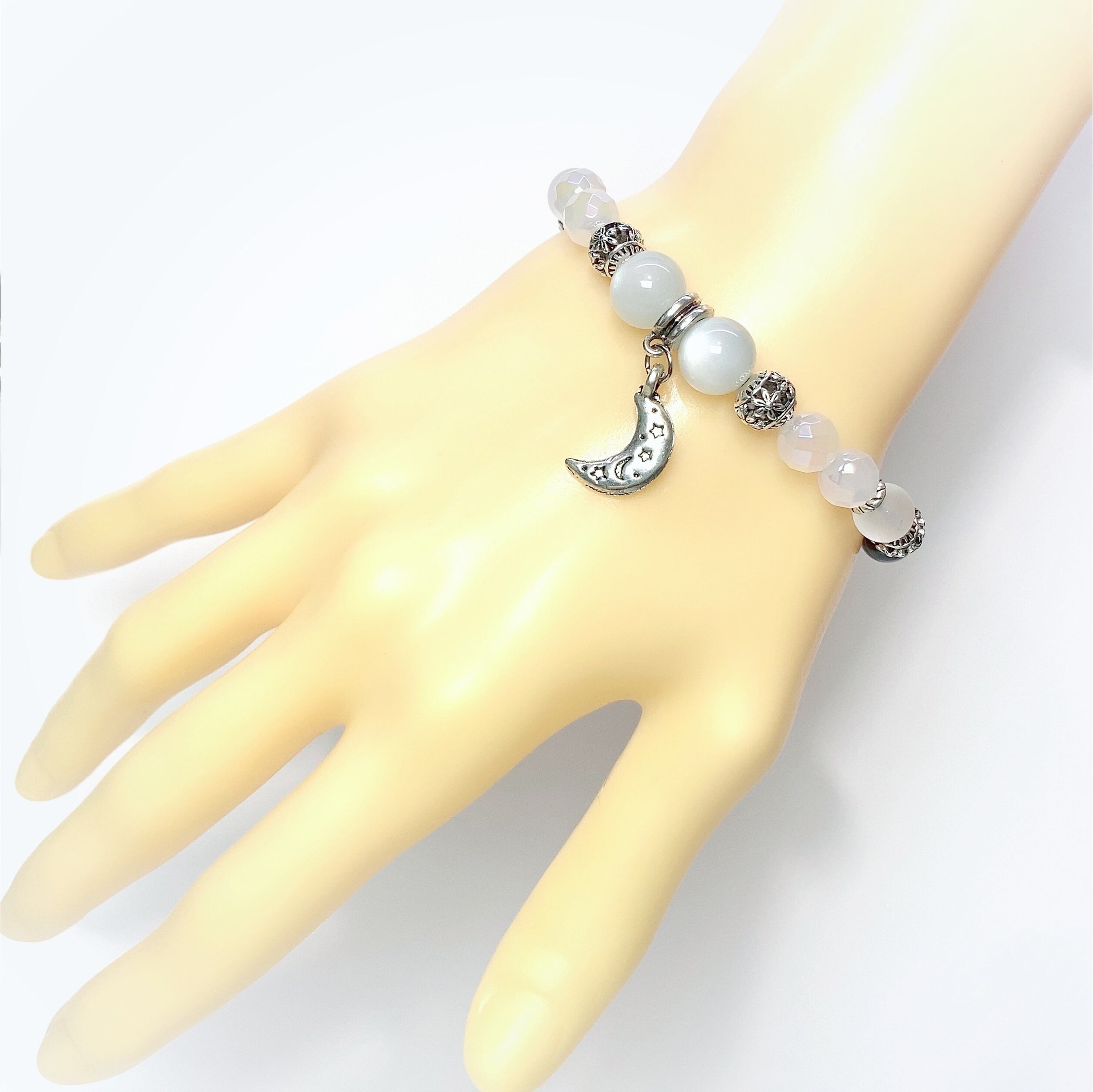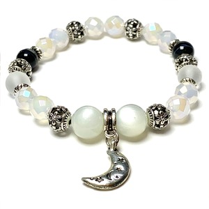 【1/31迄35%OFF】輝くホワイトムーンストーン♪月モチーフブレス/フラッシュホワイトカルセドニー/ストライプオニキス[B-0151]