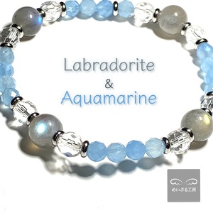 繊細なカットが施された小粒のアクアマリンをベースとして、マルチカラーのシラー(輝き)が綺麗なラブラドライトをポイントにあしらったパワーブレスです♪